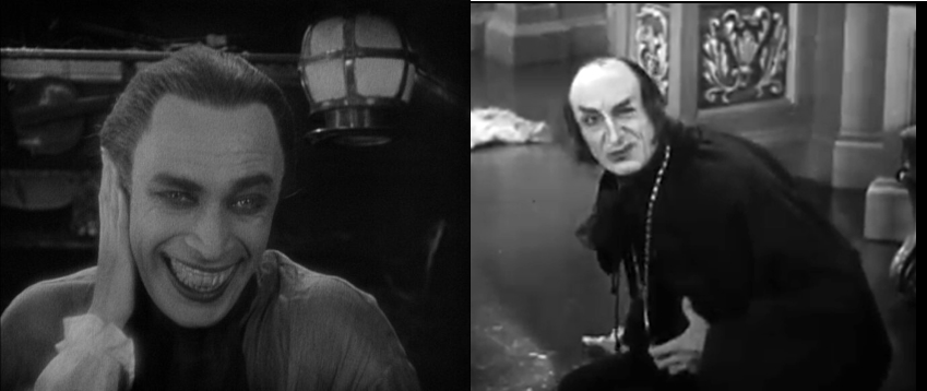 Viewed side-by-side, the Joker’s look in comic book art and animated TV shows is a composite character of both Gwynplaine (with his wide mouth, large upper teeth, combed back hair) and Barkilphedro (with his pointy chin, elongated face, and sometimes, his large, roman nose). The live-action television and film versions lean heavily into Veidt’s look as Gwynplaine. The wide smile and hair are so iconic and so ubiquitous across all depictions of Joker that when someone sees an image of Conrad Veidt’s Gwynplaine, especially with those large, upper teeth, they could easily misidentify him as the first cinematic Joker!