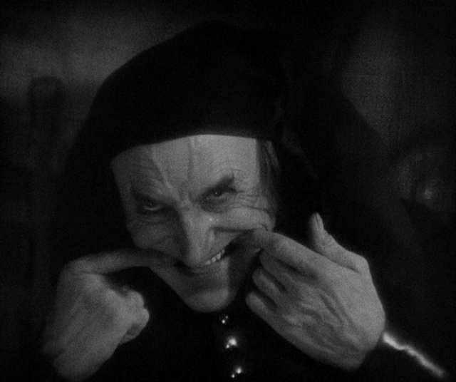 Jack Pierce, the makeup artist on The Man Who Laughs, was influenced by the German Expressionist aesthetic in designing Gwynplaine’s look. White face paint is, of course, an essential characteristic of all clown faces. But it also featured on every ghoulish character in German Expressionist films. Look at the Expressionist rogues gallery of Cesare, Dr. Caligari, Dr. Mabuse, among others; they all have white faces with dark eye makeup.