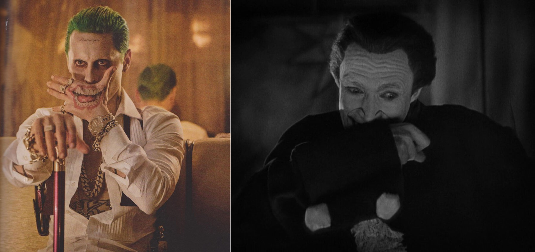 The DCEU introduced us to a new Joker who was set to feature in multiple films. Played by Jared Leto, he looked like a punk-rocker crossed with a gangster when he first appeared in Suicide Squad (2016). Audiences didn’t take to his crazed, unblinking look, and those tattoos and silver teeth. Still, the basis for Leto’s look is Gwynplaine with his combed-back hair and wide smile. Even the silver teeth grills are a riff on Gwynplaine’s large upper teeth, though it may have been unintentional. Leto’s Joker does, however, have one explicit nod to Gwynplaine. He has a tattoo of a mouth on his left hand, which he holds over his own mouth just like Gwynplaine did with his hand when he shyly covered his mouth.