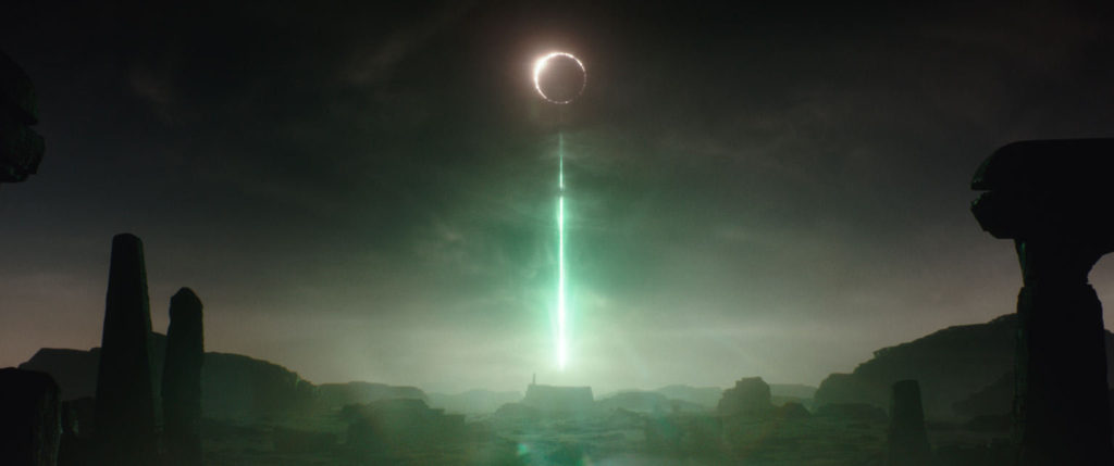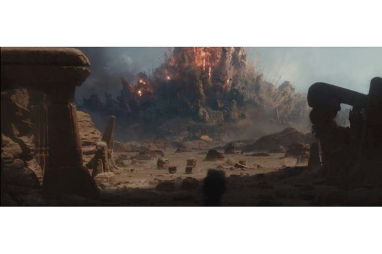 The sequence starts with the reveal of the Death Star from the dark side of Jedha as it obits above the orange and purple landscape below. Then as the planet-killer eclipses Jedha’s Sun, the brilliant blue sky is cast into darkness, a visual metaphor for what is about to happen. Moments later a single green blast pierces the darkened sky causing an orange-yellow fireball on the horizon. The sequence is capped off with the crew of Rogue One narrowly escaping a tsunami of earth-toned rock and rubble generated by the blast.