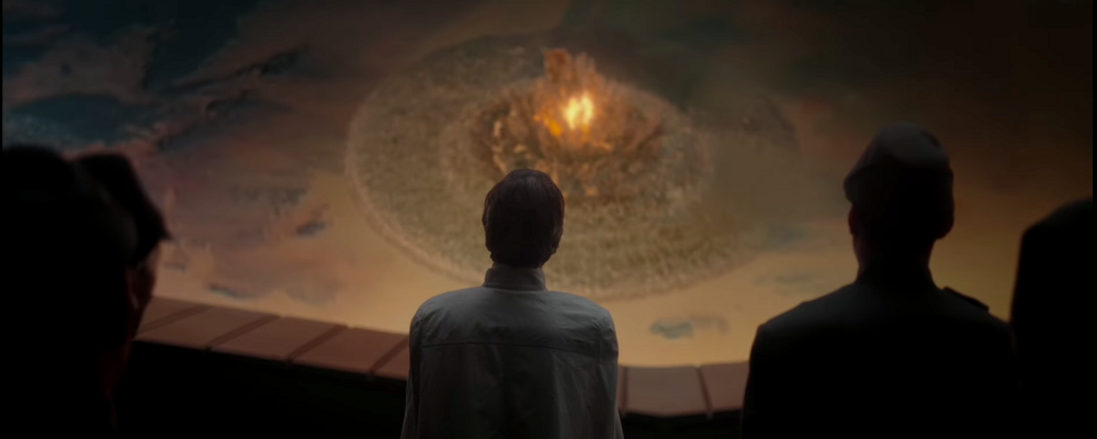 “And it’s very, very far off in the distance. And we really just wanted to communicate the sort of apocalyptic mood of that. And we came across this particular image. It’s a photo of a nuclear bomb test called Castle Bravo. And it’s taken in 1954. Now, nothing about the color or exposure of this is representative of how this might look in real life.