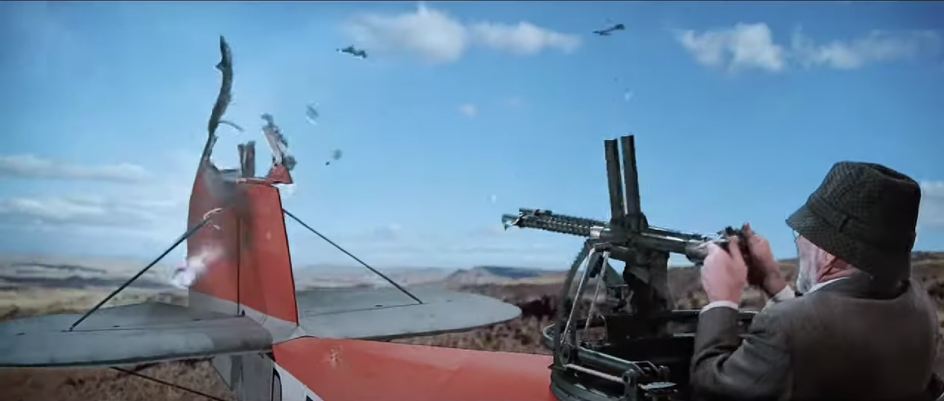 Shorty blasts after the second biplane. Following the biplane with his gun, Shorty makes a critical error which is reminiscent of a sequence in Indiana Jones and the Last Crusade.