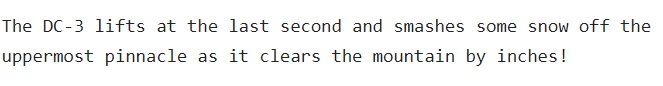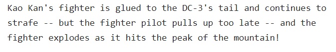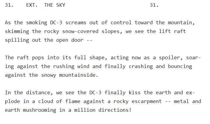 This action moment remains in the final scene. But in the first draft, this is also how the final biplane meets its demise. Following too close behind the DC-3, the pilot of the last biplane cannot see the mountain peak until it is too late.